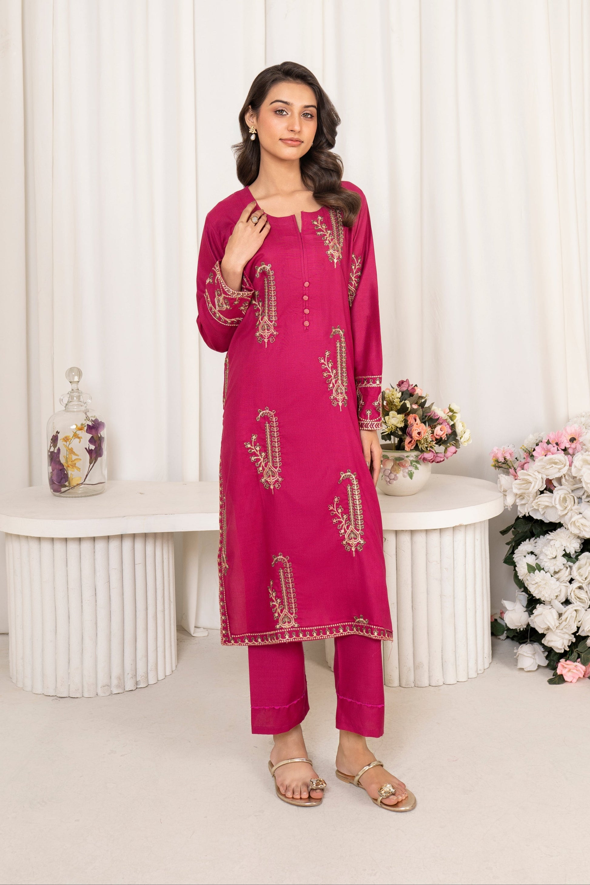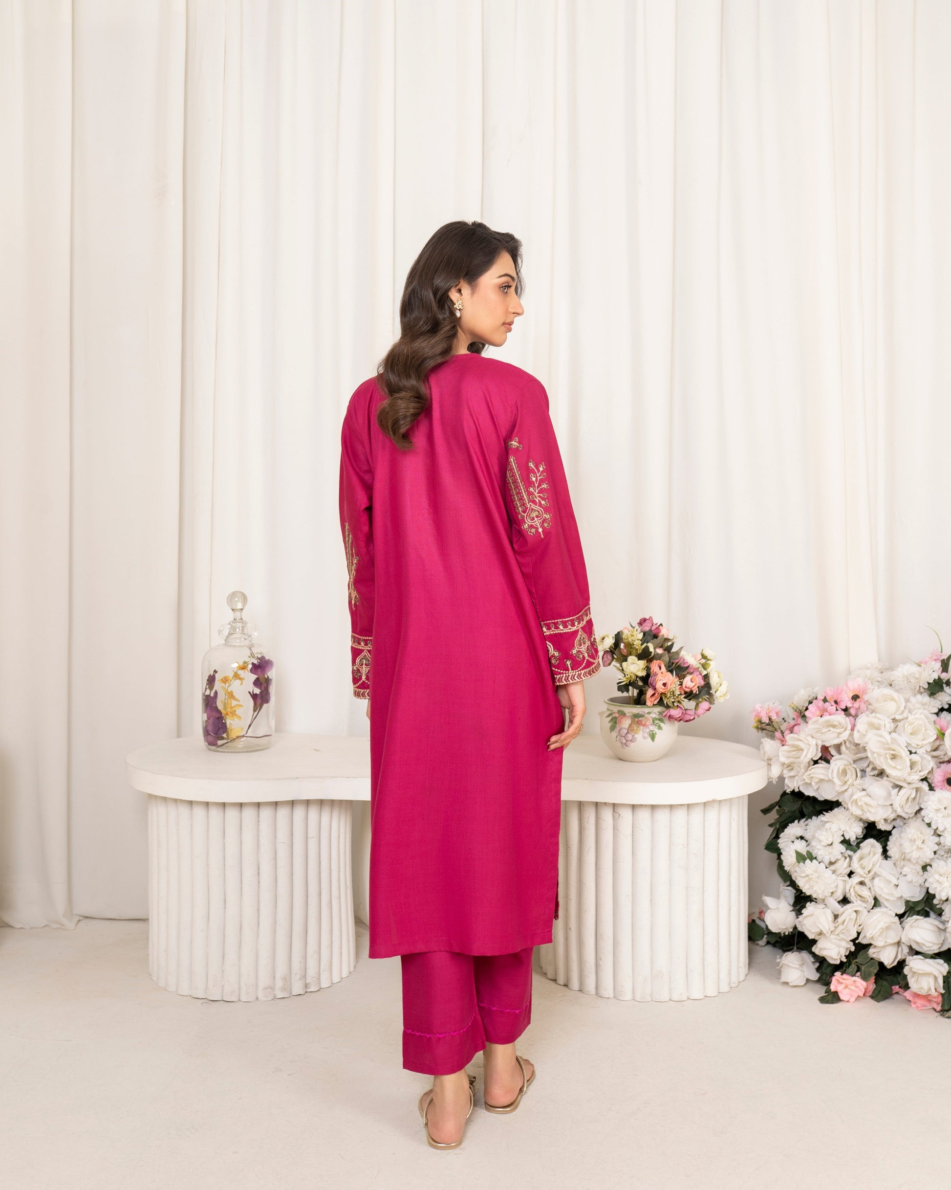 Introducing our luxurious purple embroidered two-piece article, perfect for winter styling. Crafted from warm, high-quality fabric, this ensemble features a beautifully embroidered shirt paired with matching trousers, adding a touch of elegance to your cold-weather wardrobe. The rich purple hue, complemented by intricate embroidery, makes it ideal for festive occasions or cozy gatherings. Stay stylish and comfortable all season long with this sophisticated and chic outfit that embodies both warmth and grace.